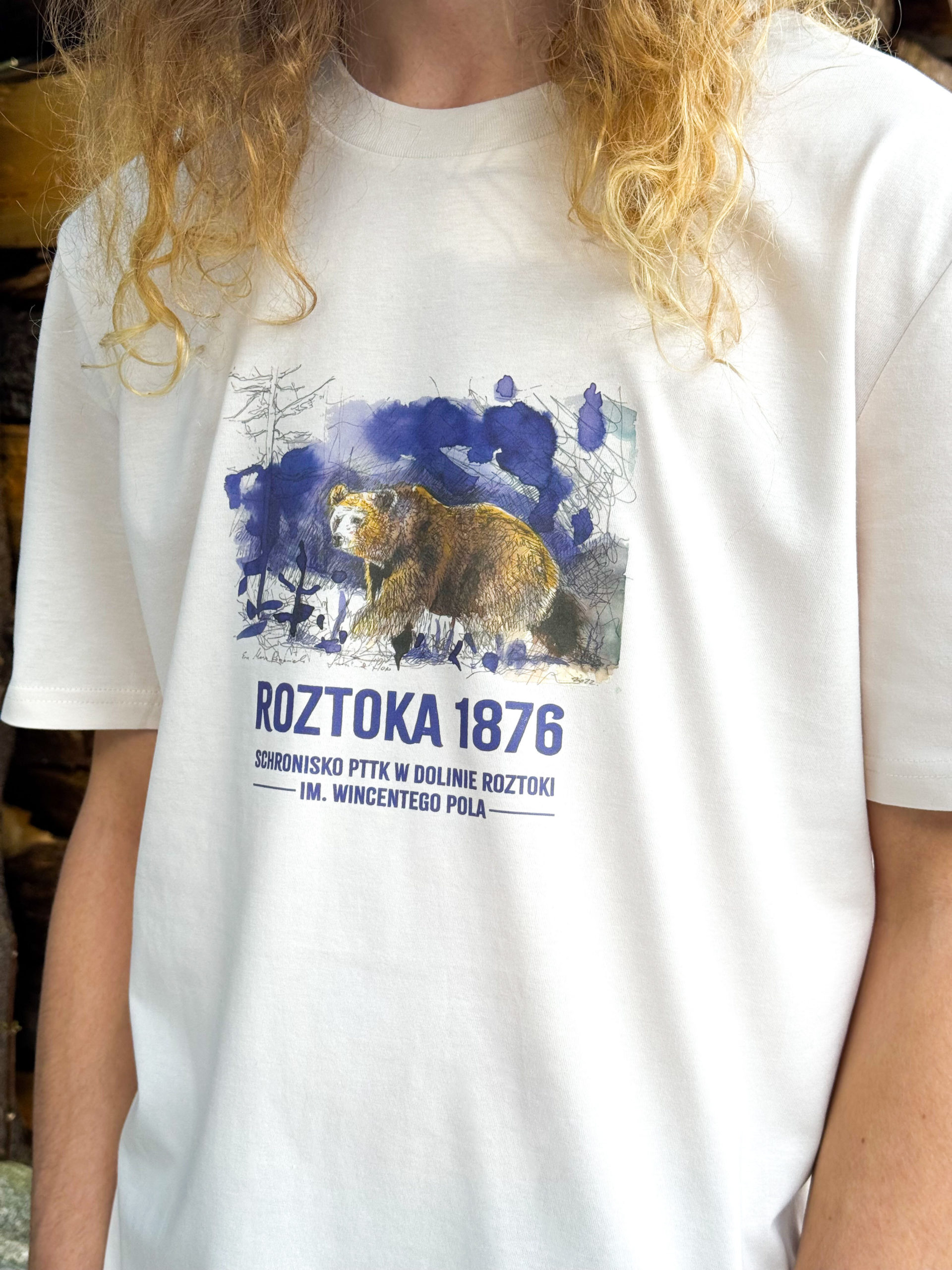 Model wykonany jest w subtelnym kolorze Vanilla Ice i ozdobiony unikatową, autorską grafiką autorstwa Ewy Romaniak. Z boku koszulki znajduje się elegancka wszywka z logiem schroniska, na karczku zaś znalazła swoje miejsce wyjątkowa metka, obie podkreślają autentyczny charakter koszulki.